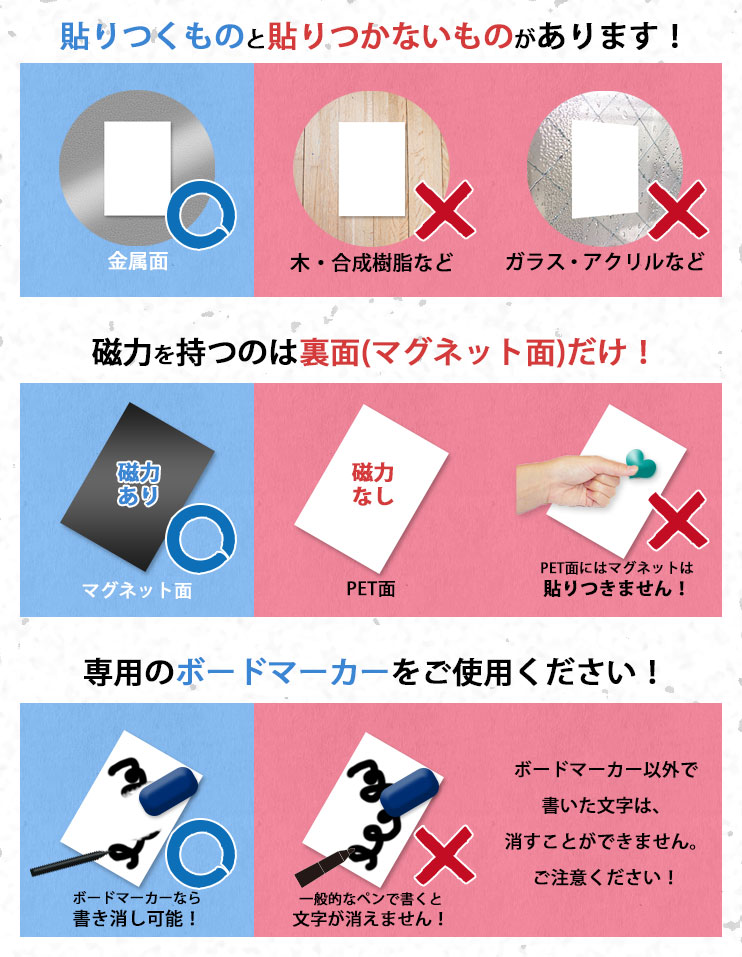 ホワイトボード式マグネットは、文字を記入したり消したりできる商品です。何も印刷をしなくても会議用や掲示板用としてご使用いただけます。
